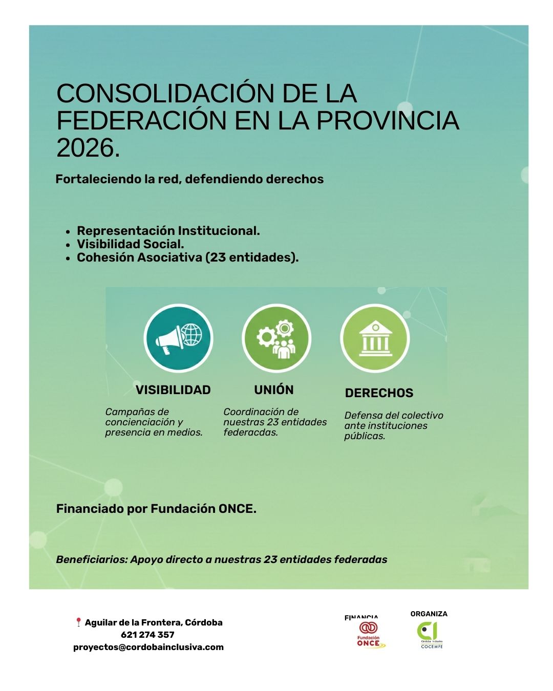 En Córdoba Inclusiva COCEMFE, trabajamos para que el movimiento asociativo de la discapacidad física y orgánica sea un referente sólido en nuestra provincia. El proyecto de Consolidación de la Federación tiene como objetivo principal fortalecer nuestra estructura para representar con mayor eficacia los derechos del colectivo.