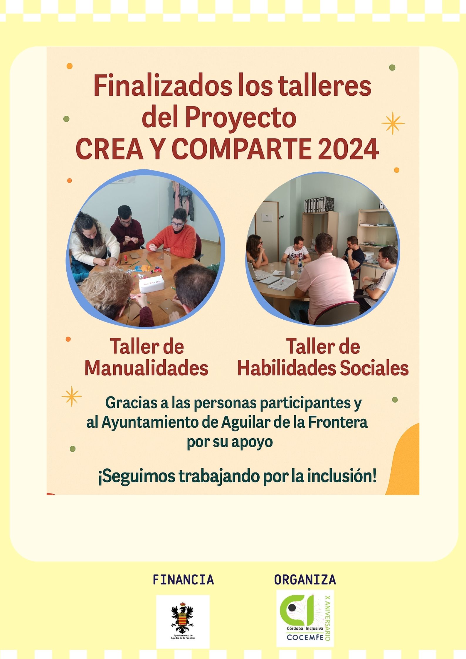 Desde Córdoba Inclusiva, en colaboración con el Ayuntamiento de Aguilar de la Frontera, hemos concluido con éxito los talleres de Manualidades y Habilidades Sociales desarrollados a lo largo de este año.